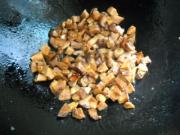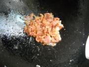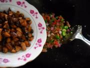 锅烧热,倒入3茶匙油,下香菇粒煎炸一下,至香菇粒边缘焦黄,盛起备用。