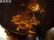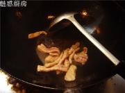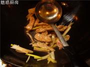 锅里淋入花椒油,油热加入肉丝翻炒变色。