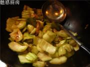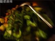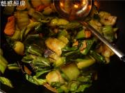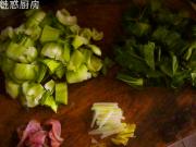 油菜洗净,叶子和油菜帮子分开切断,精肉切丝(不需要太细),葱姜切丝。
