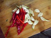 蒜切片,红辣椒切丝备用。