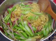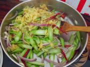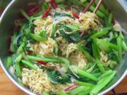 少许油炒香蒜子和红辣椒,放入菜薹和豆腐皮炒一会。