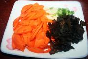 木耳泡发好,红罗卜切片,蒜葱切粒备用。