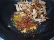 将肉推至一边,放入姜片爆香,加入半匙豆瓣酱爆出红油。