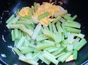放入芹菜、盐、调味酱油翻炒,出锅前放入味精调味即可。