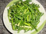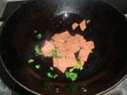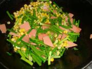 倒入蒜苔翻炒,再倒入玉米粒翻炒,放入盐,出锅前放入鸡精。