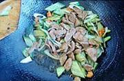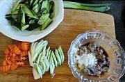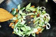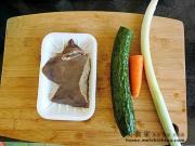 洗净后的猪肝再加入料酒,糖,生抽,淀粉腌拌均匀,黄瓜,胡萝卜,葱白切片备用。