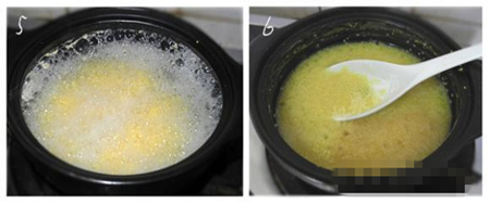 4. 锅中水开后,放入小米,用药子搅拌几下,防止粘锅。时间: