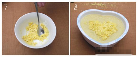 7. 鸡蛋剥去壳,取出蛋黄,放碗中用勺子碾碎。