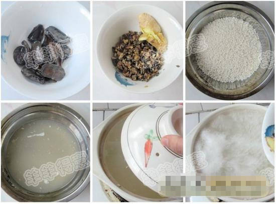 6、开锅后倒入鲍鱼和生姜,改成小火慢煮,看到米粒舒展后关火盖上盖子闷15分钟,然后再开火煮到米粒开花粘稠。