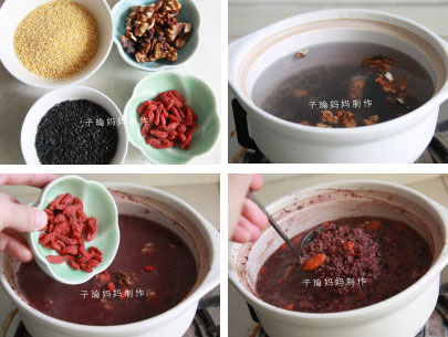 1、将小米和黑米淘洗干净,倒入砂锅中,加入核桃,开烧拉;