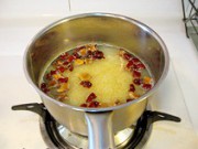 取汤锅,注入适量清水,烧开后放入小米,转小火慢慢熬煮。