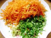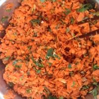 将胡萝卜洗净擦成丝(如果丝太长就改下刀,不要切太碎),香菜洗净切成碎段。