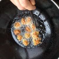 锅中放油待油温60度左右时下丸子(关中火保持油温不能太热),用手和勺子,左手攥右手用勺一舀,要做得大小均匀</p>